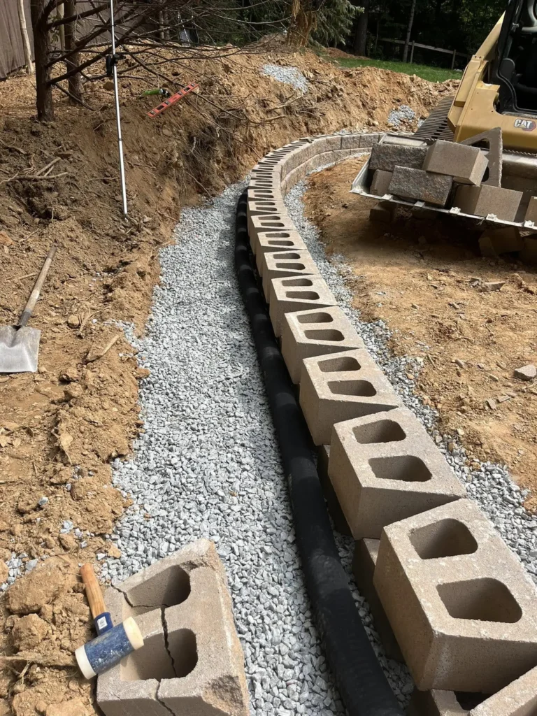 ENS specializes in grading and retaining walls so we don’t need to outsource any equipment or crew. That means proper excavation, compacted base, and elevations set correctly before a single block or stone is placed.